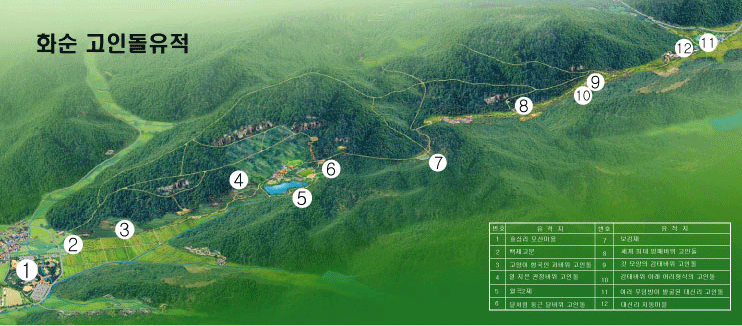 被指定为国家史迹410号,按主要地区分为怪岩支石墓地区(47基)、官厅岩支石墓地区(190基)、月形岩支石墓地区(40基)、乒麦岩支石墓地区(133基)、斗笠岩支石墓地区(140基)、大薪里发掘地(46基)等,在此596基支石墓密集分布.