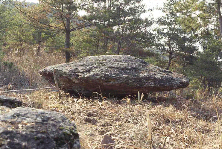 卓子式支石墓は板石で構築した埋葬主体部が地上に露出している型式で、4枚あるいは6枚以内の板石を組み合わせた石室の上に平らな上石が載せられたものである.主に漢江以北から中国遼寧地方に集中分布していることから北方式とも呼ばれる.北朝鮮では五徳型と呼び、中国では家の形を呈していることから石棚と呼ぶ.卓子式の中で大型のものは主に祭壇や記念物として築造されたものである.これまで発見された卓子式支石墓の分布の南限は、慶尚南道の居昌と全羅南道の霊岩、康津である.