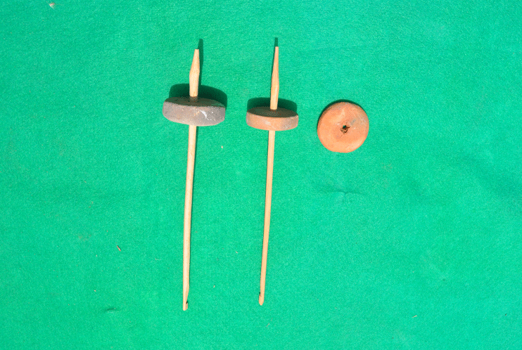 紡錘車は糸を紡ぐ際に用いる紡績具の一種である.紡錘車の中央には回転力を利用して棒を挿すことができる丸い穴があいている.この穴に紡錘車の軸になる棒を挿し込んで軸を回転させながら徐々に糸を紡いだり穴をあけた.材質を見ると、土を捏ねて焼いたもの、石で作ったもの、土器の破片を磨いて作ったものなどがある.